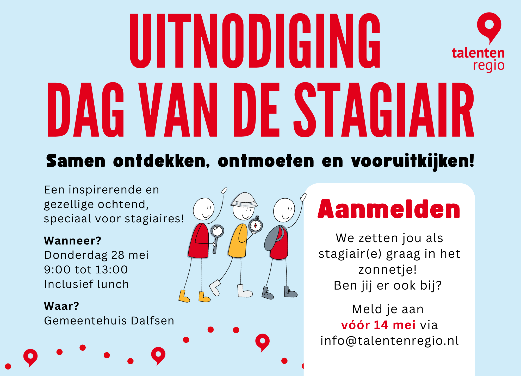 Jij bent er toch ook bij? Meld je aan vóór donderdag 14 mei via info@talentenregio en deel deze uitnodiging met de mede-stagiaires in jouw organisatie!